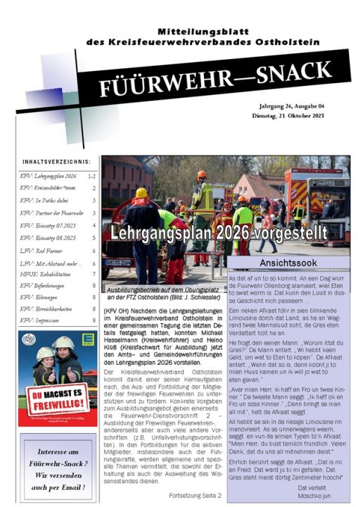 - Der neue Füürwehr-Snack 04/2025Mitteilungsblatt des Kreisfeuerwehrverbandes Ostholstein Ausgabe 04 | 21. Oktober 2025